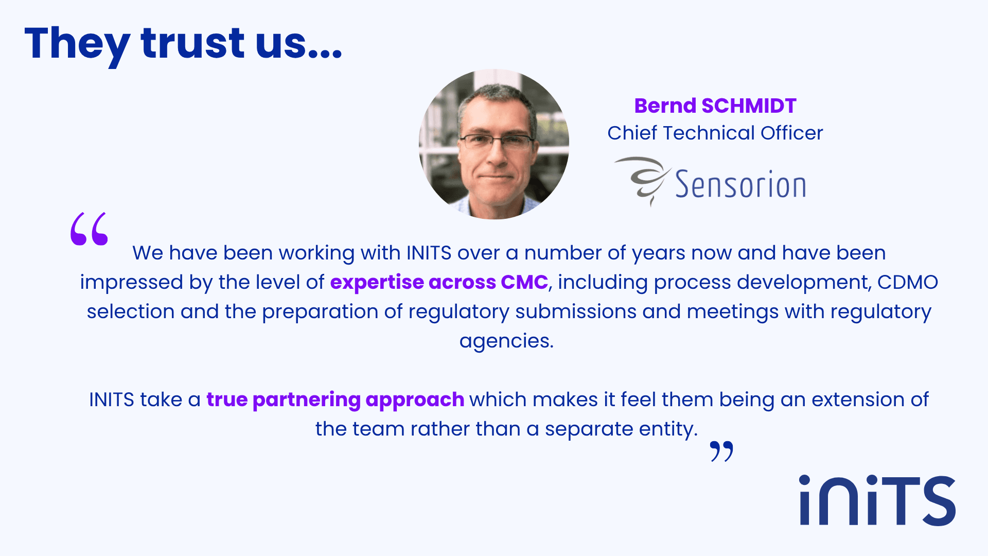 “We have been working with INITS over a number of years now and have been impressed by the level of expertise across CMC, including process development, CDMO selection and the preparation of regulatory submissions and meetings with regulatory agencies.